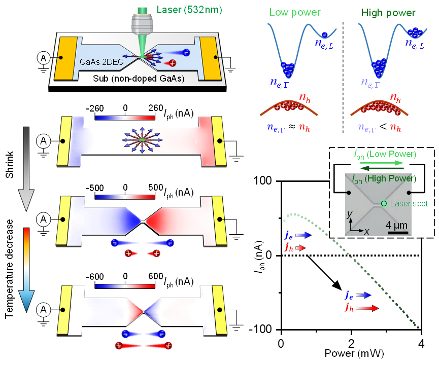该工作在砷化镓(GaAs)纳米收缩沟道中实现了零偏置的 Shockley–Ramo(SR) 双极性光电流,并可通过结构几何、光功率与温度进行“可编程”调控。团队提出并实证:纳米级几何约束重塑载流子扩散,且随激光激发功率增强,GaAs的Γ→L 能谷散射可可逆地调节电子—空穴不对称性,从而在同一器件上实现光电流极性可切换与幅值可调。空间分辨扫描光电流、温度/多波长对照及模型计算表明,器件响应受 SR 权重场和载流子扩散主导,与热电(PTE)效应有明显区分。最终的实验结果与所建立的 SR扩散模型高度一致。