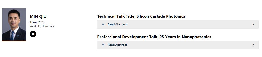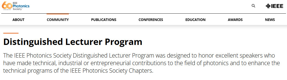 新闻动态 首页 > 新闻 > 新闻动态 > 正文 仇旻教授入选IEEE光子学会2026年杰出演讲者 浏览量:时间:2026-01-05 近日,西湖大学工学院仇旻教授入选 IEEE光子学会2026年杰出演讲者(IEEE Photonics Society Distinguished Lecturers)。在本次评选中,全球共有六位学者入选。 该荣誉旨在表彰在光子学领域作出卓越技术、产业或创业贡献的杰出演讲者,并为全球各分会提供高质量学术资源。IEEE光子学会杰出讲座项目致力于通过邀请顶尖专家进行专题演讲,推动光子学知识传播与技术交流,促进全球分会学术活动水平的提升。获选学者将在2026年度接受各分会邀请,在其会议、相关活动或技术协办的国际会议中发表特邀报告。 信息来源:https://ieeephotonics.org/community/chapters/distinguished-lecturer-program/#