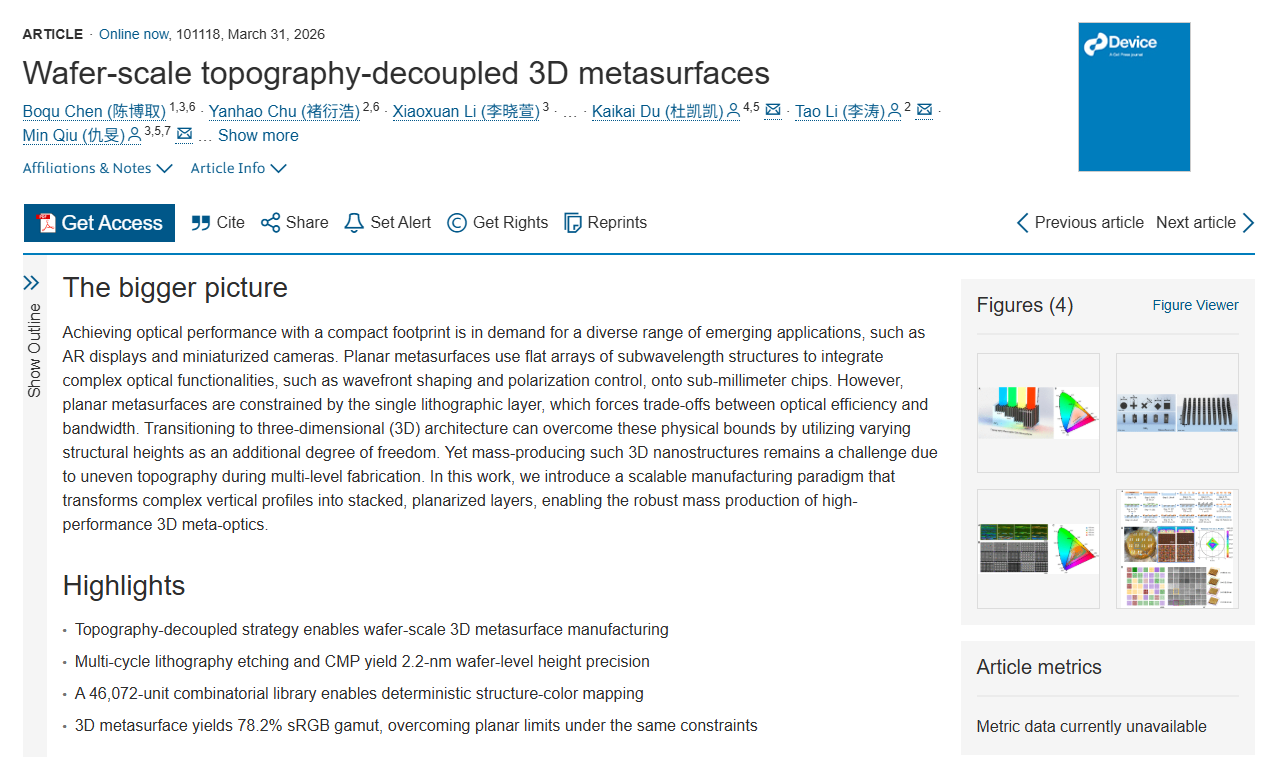 Recently, Professor Min Qiu’s research team achieved a significant breakthrough in the field of three-dimensional metasurface manufacturing. The research paper titled “Wafer-scale topography-decoupled 3D metasurfaces” authored by PhD student Chen Boqu (Class of 2021), has been accepted by the journal Device. This study presents a wafer-scale topography-decoupled manufacturing strategy for 3D metasurfaces, providing a new route toward the large-area, high-precision, and scalable fabrication of high-performance 3D metasurfaces.